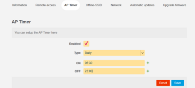 config ap-timer 'settings' option enabled '1' option type 'week' config week 'Sun' list on '06:00' list off '23:00'